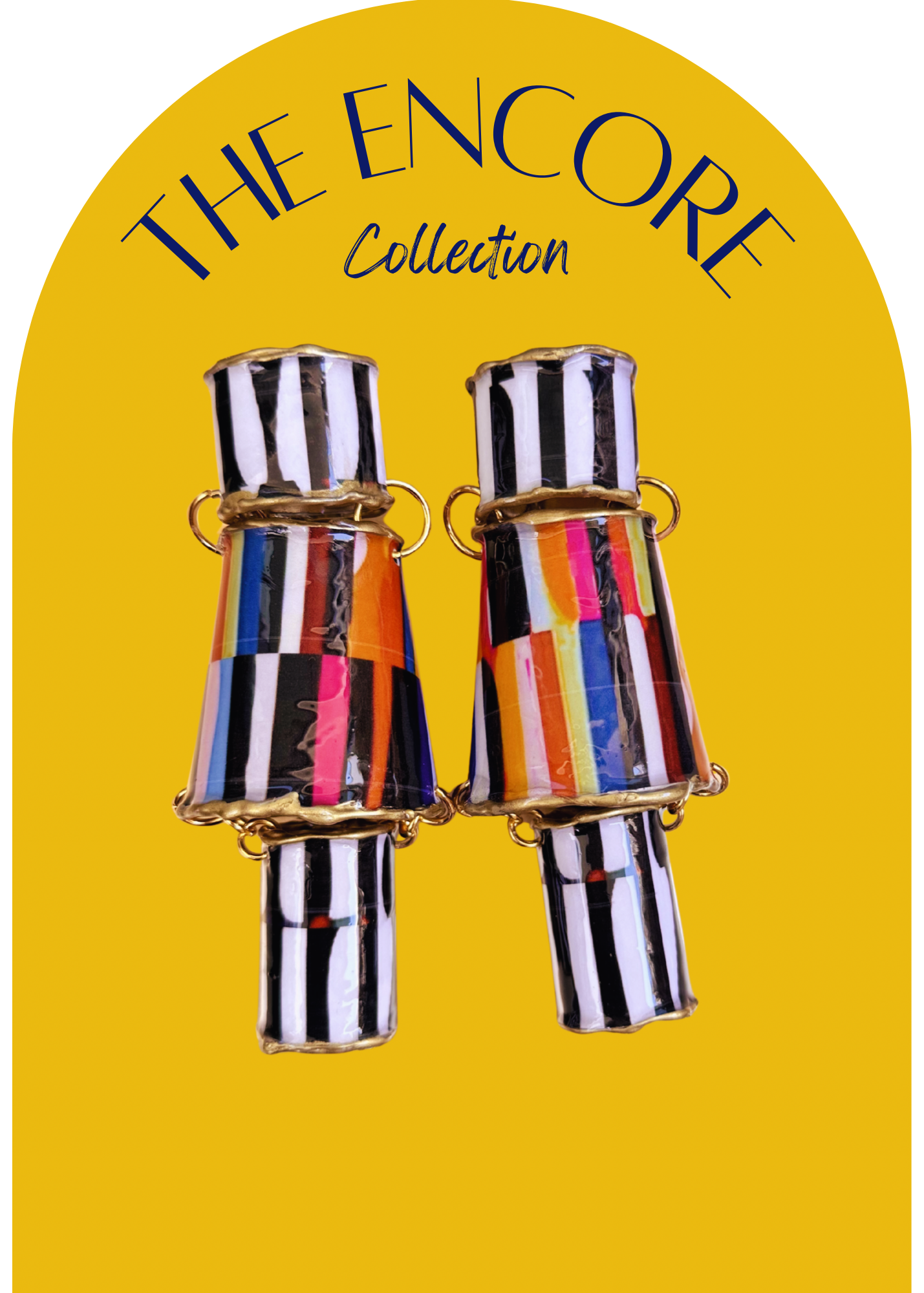 Main Character is a bold, stacked silhouette designed to command attention. Featuring vertical striping in rich, contrasting tones and sculpted gold edging, this architectural design plays with structure, color, and movement.